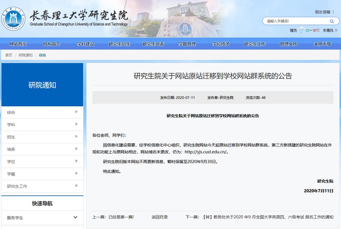 长春理工大学研究生院网站原站迁移到学校网站群系统(网站域名未更改)